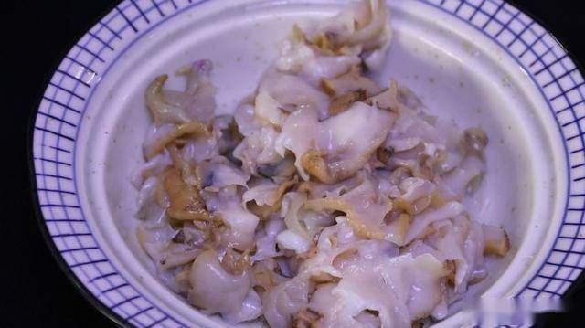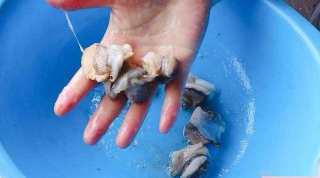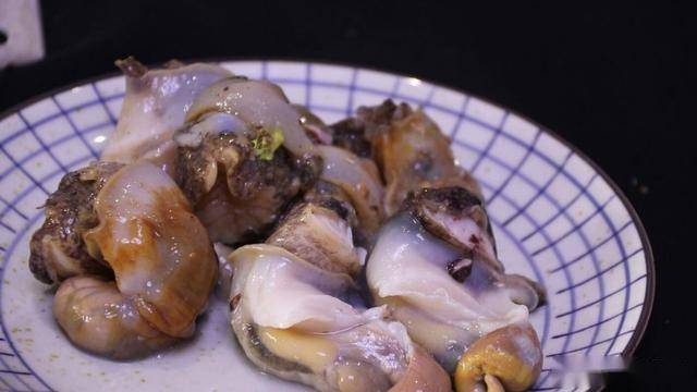 摘除螺肉中間的內臟和尾部,我們只取海螺的頭部,用鹽抓洗揉搓,搓出黏液,再用清水清洗干凈。