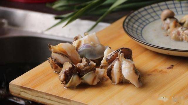 用廚房紙巾或者干凈的毛巾吸掉海螺肉表面的水分。一手按住螺肉,一手拿刀片螺肉,把螺肉片成薄薄的一片。