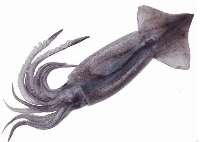 魷魚,也叫海兔子,體圓錐形,體色蒼白,有淡褐色斑,頭大,前方生有觸足10條,尾端的肉鰭呈三角形